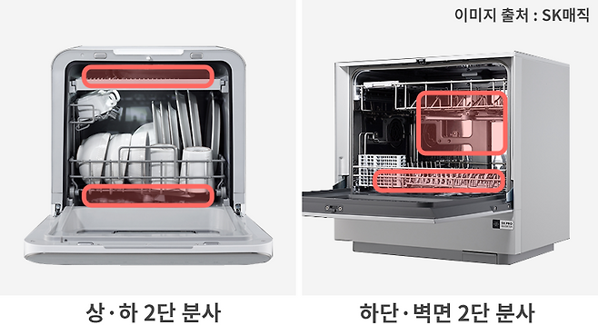 3-6인용 기준으로 생각했을 때에는, 상단/하단 혹은 상단/벽면에 2개의 물분사 장치를 갖춘 제품이면 충분합니다. 그런데 간혹 3인용 제품의 경우, 하단에 1개의 물분사 장치만을 갖춘 제품이 있습니다. 이런 식기의 위쪽에는 비교적 약한 물살이 사용되어 세척력이 떨어질 수 있으니, 이를 살펴보시고 구매하시기를 바랍니다.