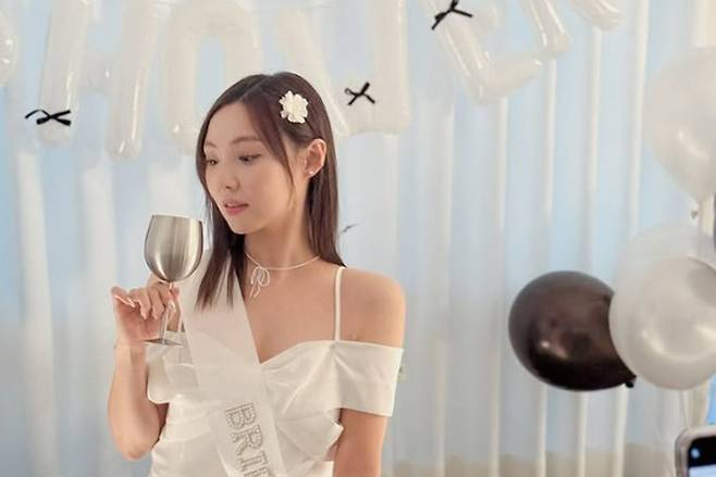 공개된 사진에는 순백의 오프숄더 드레스를 입고 ‘BRIDE’라고 적힌 띠를 두른 민이 지인들과 함께 파티를 즐기며 환한 미소를 짓는 모습이 담겼습니다.🥰