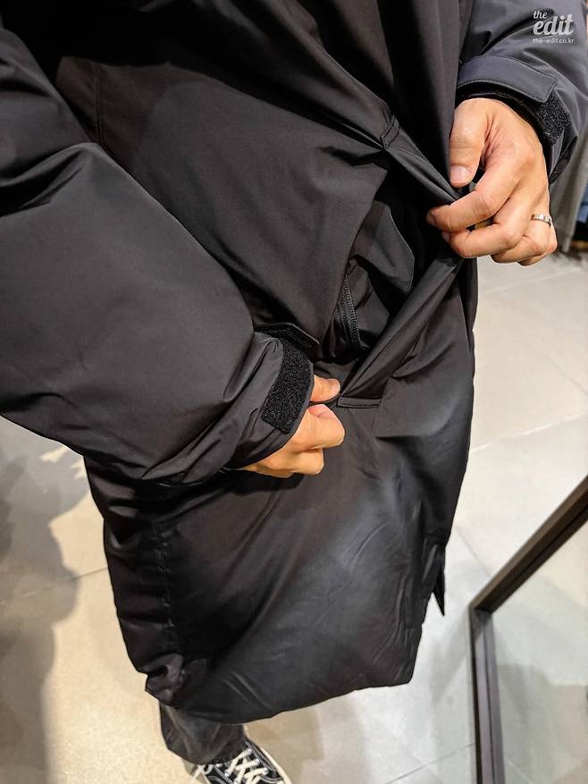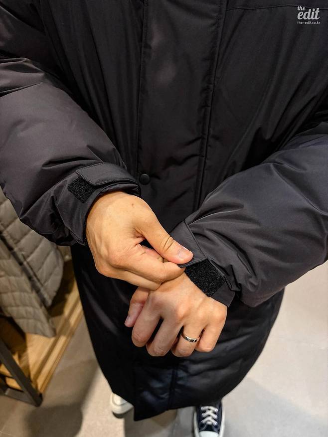 후드는 얼굴 전체를 감싸는 사이즈라 썼을 때 포근한 편이고, 목도리만 하나 둘러준다면 한파 예보가 있는 날에도 충분히 견딜 수 있을 거란 생각이 들었습니다. 소매도 벨크로 처리되어 있습니다. 가격은 17만 9,000원. 구매는 여기(https://tinyurl.com/8vwwzrap).