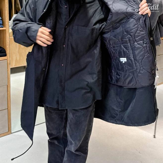 그런 분들께 적극적으로 권하고 싶은 품목입니다. 탈착 가능한 퀼팅 라이너 자켓이 포함되어 있고, 패턴 자체가 여유로워서 이것저것 겹쳐 입기 정말 편합니다. 올리브 색상이 너무 튀거나 군용품 같아서 꺼려진다면 주저 말고 블랙을 입어 보기 바랍니다. 오히려 흔하지 않은 실루엣과 색상이라 마음에 들 겁니다.