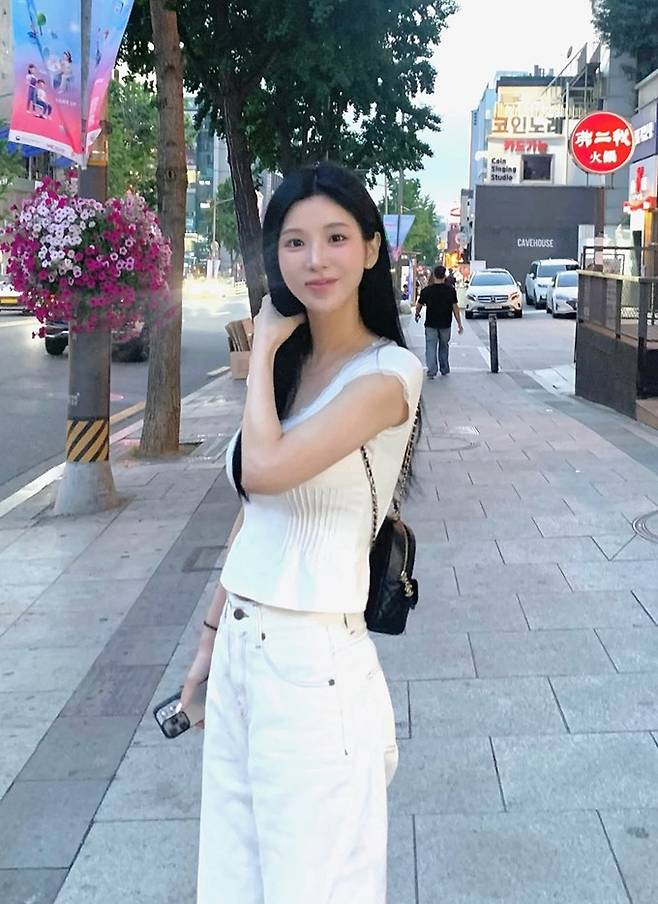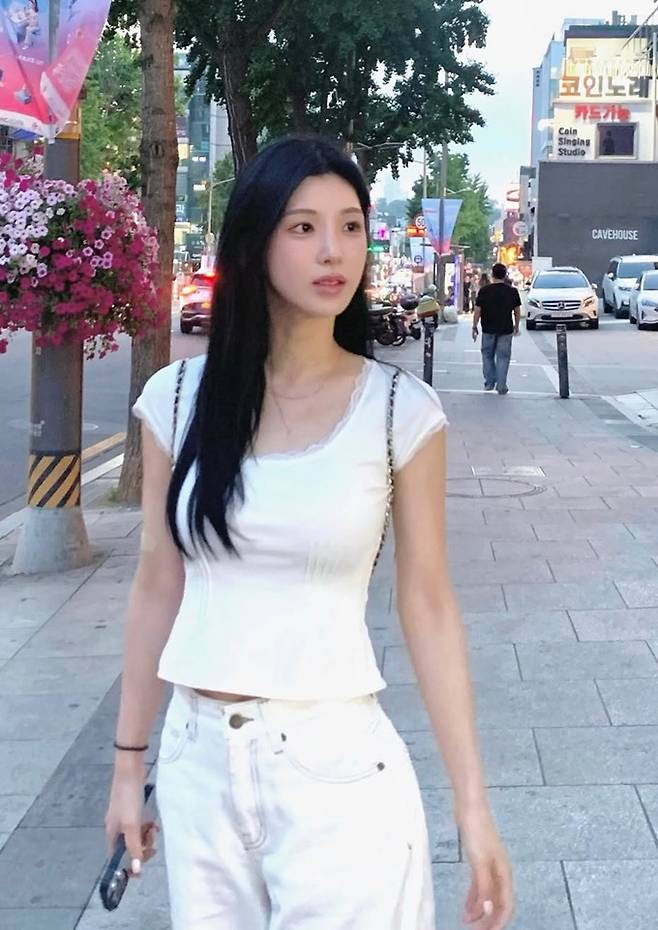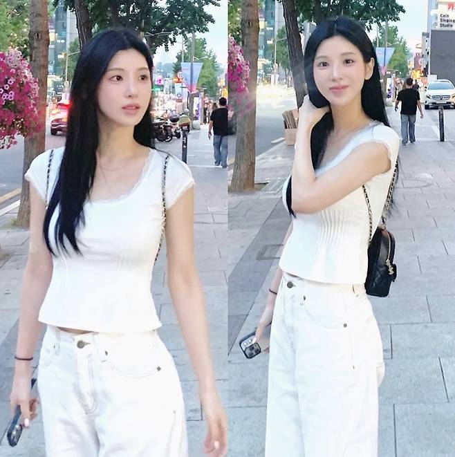 배우 강석우 딸 강다은이 화이트 톤온톤 스트릿룩으로 아빠를 닮은 순백의 순수 매력을 드러냈다.