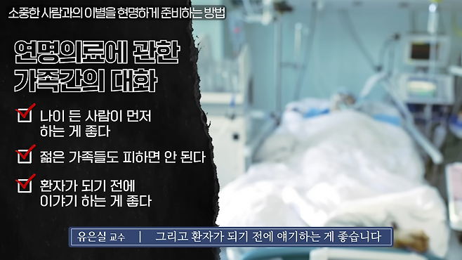 요양병원에 계신 분들, 말기 치매 이런 분들도 기회 있을 때 이야기를 나누고, 혹시 자녀들 걱정 때문에 잘못 선택하시는 건 아닐지 자세하게 물어봐서 가족들은 이미 다 아는 상태가 필요하다.