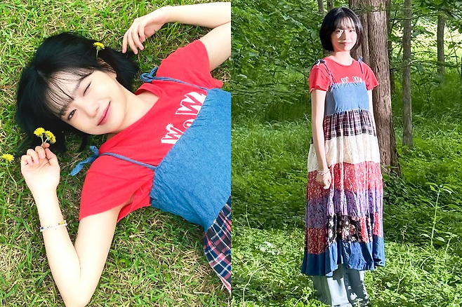 여기에 붉은 티셔츠가 원피스의 컬러 포인트와 조화를 이루며 전체적인 룩을 더 밝고 유니크하게 완성했다.