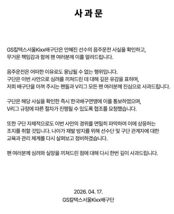 2026년 4월 17일, 여자 프로배구 GS칼텍스 서울 Kixx는 공식 SNS를 통해 주전 세터 안혜진의 음주운전 사실을 공개하고 공식 사과했습니다. 지난 4월 5일, 챔피언결정전 우승을 차지하며 최고의 기쁨을 누린 지 불과 12일 만에 터진 참사입니다. 안혜진은 16일 오전 음주운전을 하다 경찰에 적발되었으며, 이후 구단에 이 사실을 자진 신고한 것으로 알려졌습니다. GS칼텍스 구단은 "음주운전은 어떠한 이유로도 용납될 수 없는 행위"라며 한국배구연맹(KOVO)에 즉각 통보하고 엄중한 처벌을 예고했습니다.