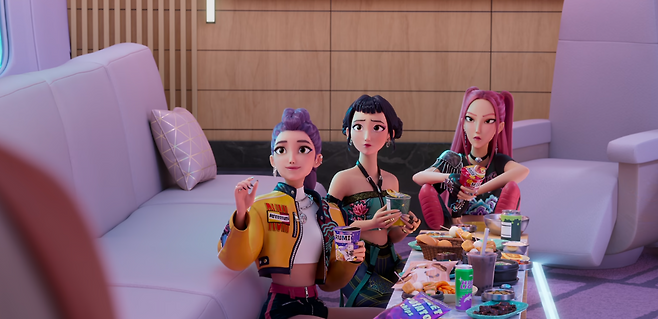 가장 유명한 장면은 바로 거실에서의 식사 장면. 세 주인공 루미, 미라, 조이가 소파를 등받이 삼아 바닥에 옹기종기 앉아 라면, 순대. 어묵 등 각종 분식과 배달 음식을 먹는 장면이다. 소파는 앉는 용도가 아니라 기대는 용도이며, 음식을 소파에 흘릴까 조심해 바닥에 앉는다는 점에서 한국 시청자들은 고개를 끄덕일 수밖에 없다. 댓글에는 “이제 보니 얘네 소파 냅두고 바닥에 앉아 있음”이라는 반응까지 등장해 폭소를 자아냈다.