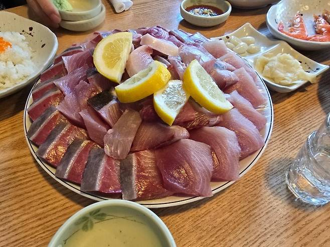 바다회사랑이 방어회 성지라고 불리는 이유 중 하나이다. 부위별로 골고루 담았다고 하는데, 방어회가 워낙 기름진 회다보니 느끼함을 잡아주기 위한 레몬이 곁들여져 나온다.