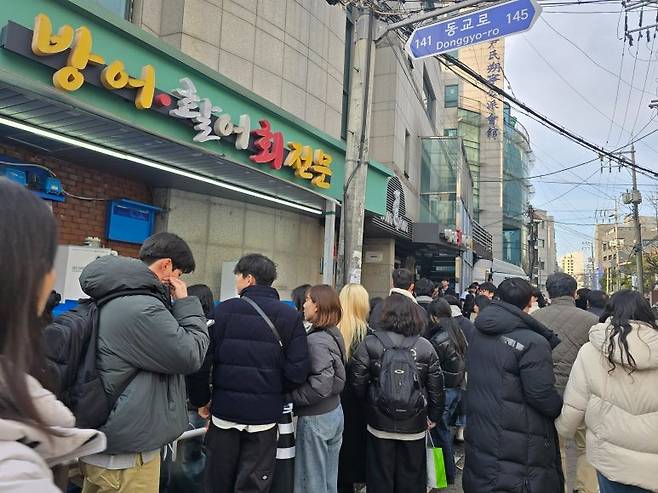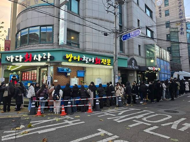 그 중 한분이 어디선가 바다회사랑의 방어가 기가 막히게 맛있다는 소문을 듣고 작년에 1호점에서 웨이팅을 시도하며 기다리다 추워서 철수한 아픔을 안고 이번엔 제대로 성공해보자는 포부를 품고 꼭 여기서 방어를 먹자는 결의를 하고 철저하게 계획을 세웠다.