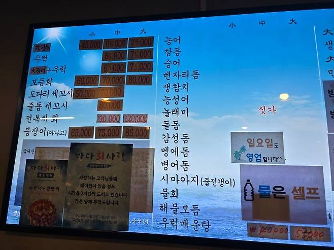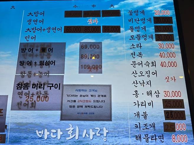 가격이 잘 보이지 않지만 대사이즈 대방어 가격이 싸 보이진 않는다. 코로나시절 물가상승에도 불구하고 가격인상을 하지 않았지만, 최근에 가격을 조금씩 올리고 있다고 한다.