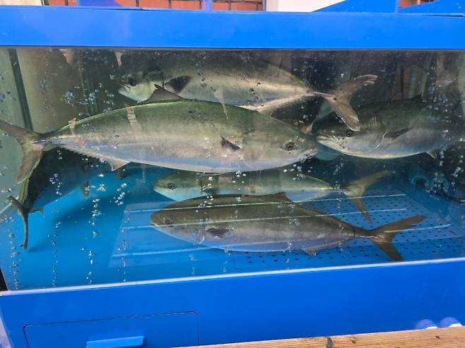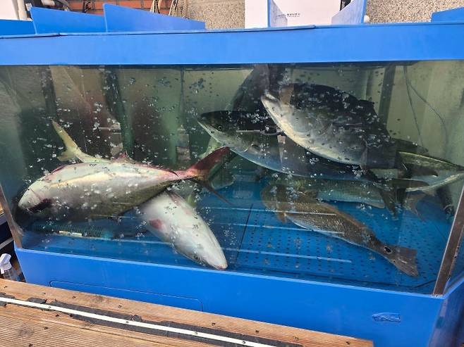 오픈시간이 넘어도 쉽사리 테이블에 착석할 기회가 주어지지 않는다. 순서를 기다리며 천천히 천천히 앞으로 움직이다 보면 바다회사랑에서 직접 공수한다는 10키로 이상의 대방어를 감상할 수 있다. 모양새를 보아하니 민어도 노니고 있음