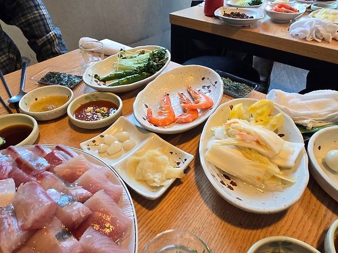 선배님께서 간절하게 원하셔서 오셨지만, 솔직히 필자는 방어회 별로 안좋아한다. 기름져서 맛있다고 하는 참치 뱃살, 광어 뱃살, 연어회 등등 모두 별로. 거기다 두툼하게 썰어져 나오면 기름짐이 입안 가득히 퍼지는걸 감당못해 더 별로라 딱 세점 먹어서 주관적인 관점으로 리뷰 남기기가 힘들다고 생각했지만, 스페인에서 오래 생활하신 가이드님께서 방어회는 난생 처음이라고 하셨는데, 이렇게 맛있는 회는 처음이라고 난 딱 세점 먹은 방어회를 거의 다 드시고 한시간 이상 기다린 보람이 있다며 먹는 내내 극찬하셔서 그분의 소감평으로 바다회사랑 방어회 후기를 대신하려 한다.