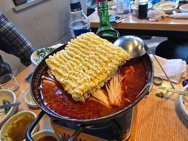 주위를 둘러보니 테이블마다 이 모양새로 뭔가를 끓이고 있길래 라면인가 하고 종업원에게 여쭤봤더니 매운탕에 라면사리 추가한것이라 하여 젊은 친구들 트랜드에 맞추려고 우리도 매운탕에 라면사리 추가 주문해봤다.