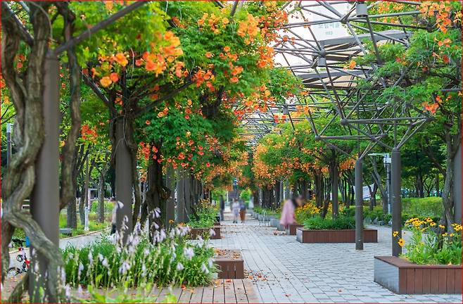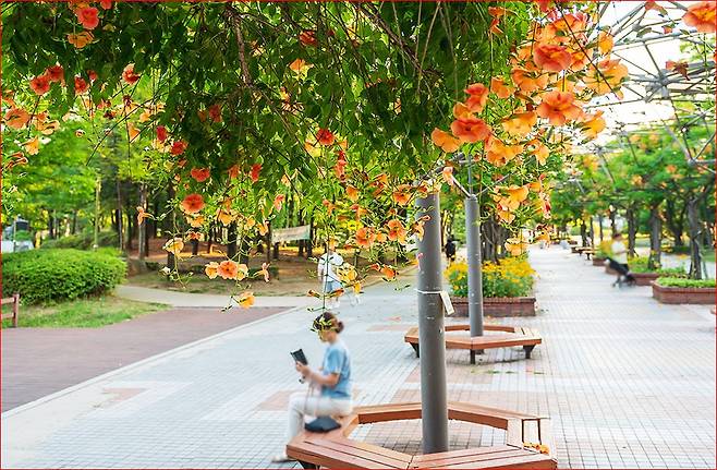 6월이 되면 부천 중앙공원은 전혀 다른 얼굴을 보여줍니다. 공원 곳곳을 수놓은 주황빛 능소화가 연못과 분수, 인공섬과 어우러져 도시 한복판에서 보기 드문 환상적인 풍경을 연출하죠.