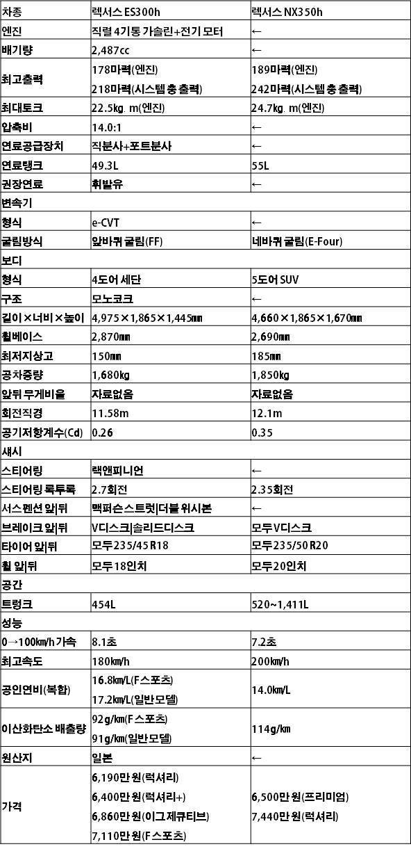 우린 ‘안락함은 세단, 공간은 SUV’라는 뻔한 결론은 내기 싫었다. 대신 장거리 주행 연비와 가속 및 제동 성능, 레이저 측정 장비를 통한 실내 공간 비교 등 다양한 부문에서 두 차를 저울질 했다. 수입 하이브리드카 시장에서 오랜 시간 1위 자리를 지켜온 ‘터줏대감’ ES300h와 최신 플랫폼과 인포테인먼트 시스템으로 무장한 신형 NX350h, 어떤 차이가 있었을까?