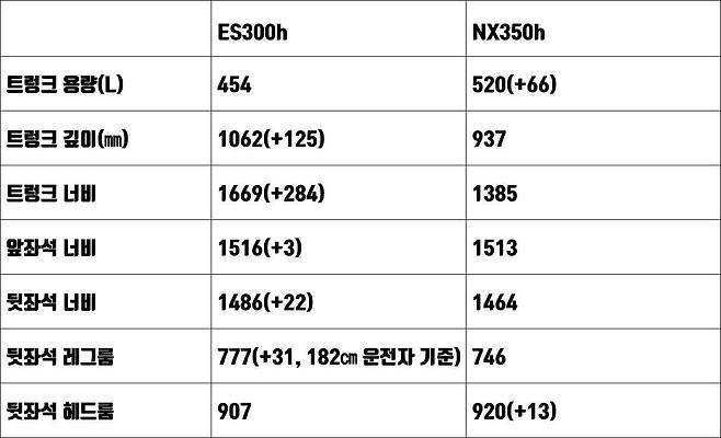 실내 공간은 두 차가 거의 비슷했다. 레이저 실측의 오차범위를 감안하면, 앞뒤 좌석의 좌우 너비는 거의 같은 수치가 나왔다. 대신 2열 공간의 차이는 제법 눈에 띄었다. 키 182㎝ 운전자가 앞좌석을 맞추고 뒤에 앉았을 때 다리 공간은 ES가 777㎜, NX가 746㎜(2열 등받이에서 1열 등받이까지 거리). 두 모델의 휠베이스 차이(ES : 2,870㎜ / NX : 2,690㎜)가 고스란히 반영됐다.