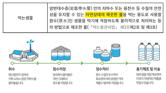 생수는 지하수 혹은 용천수를 최소한의 물리적인 여과 과정만을 거쳐 만든 물로 '먹는 샘물'이라 합니다.