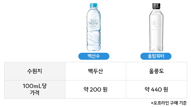 예시의 두 제품을 보면, 수원지는 경기도 포천 이동면으로 동일한데 가격은 20% 이상 차이가 납니다.
