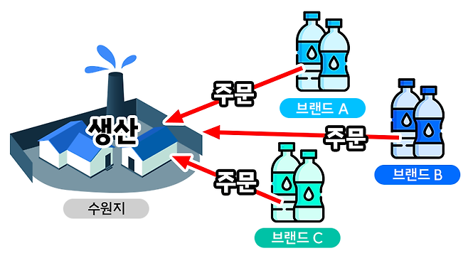 한편 생수를 판매하는 브랜드는 제조 업체에 주문을 의뢰해서 제품을 받아옵니다.