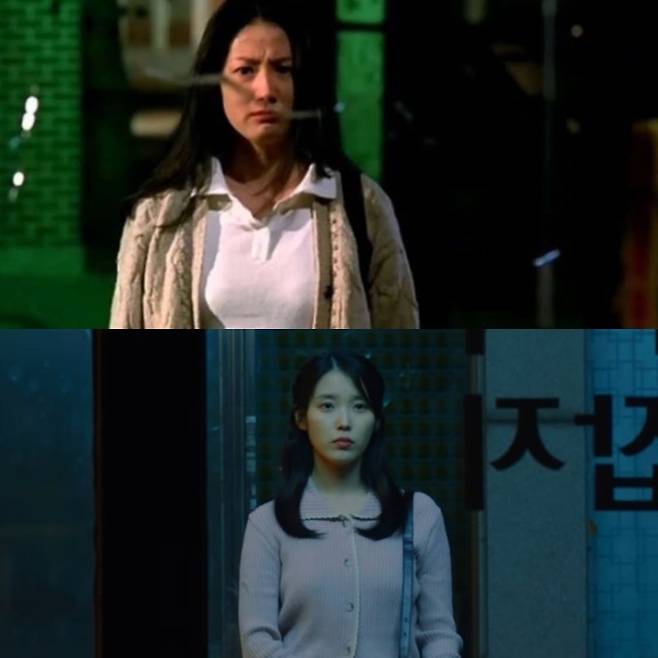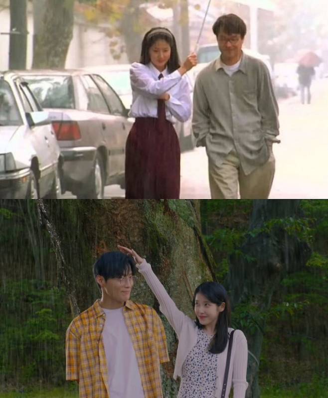 영화 속 한석규 배우님이 심은하 배우님 쪽으로 우산을 한껏 기울여 감정을 표현했던 우산 씬! 뮤비에서는 아이유가 장난스러운 표정으로 허남준 배우님의 머리를 막아주는 모습으로 재해석됐어. 진짜 귀엽더라 ㅋㅋㅋ 문 닫힌 가게를 바라보는 장면에서 심은하 배우님은 뾰루퉁한 느낌, 아이유는 걱정되는 느낌으로 표현한 것도 인상적이었어.