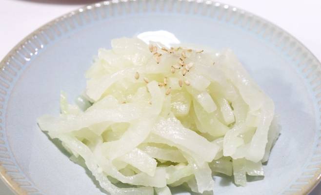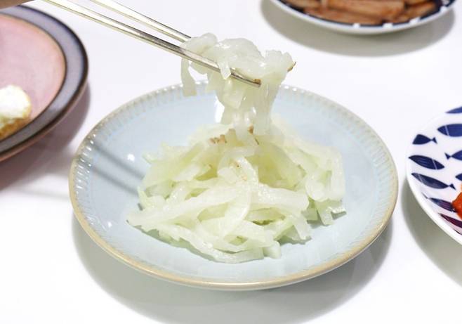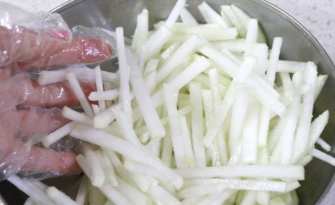 무를 썰 때 가로가 아닌 세로 방향(결 방향)으로 채를 썰어보세요. 수분이 덜 빠져나와 마지막 한 점까지 아삭한 식감을 즐길 수 있습니다.