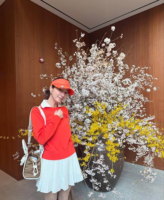 화사한 봄 분위기를 물씬 풍기는 스타일링을 선보이고 있는 이민정. 선명한 레드 컬러의 상의와 화이트 플리츠 스커트의 조합으로 경쾌하면서도 여성스러운 매력을 강조하고 있다. 동일한 컬러의 바이저 캡으로 스포티한 감각을 더했으며, 베이지 컬러의 미니백으로 전체적인 균형을 맞추고 있다. 배경의 흰색 벚꽃과 노란 개나리 장식이 그녀의 봄 패션을 더욱 돋보이게 하는 가운데, 자연스러운 포즈로 계절감 넘치는 화보 같은 한 컷을 완성하고 있다.