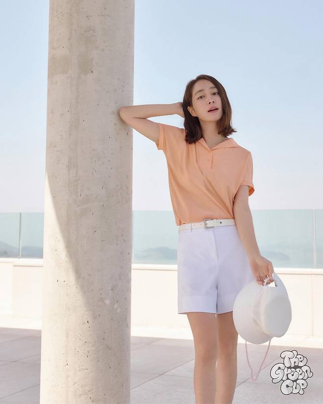 시원한 해변을 배경으로 세련된 여름 패션을 선보이고 있는 이민정. 파스텔 피치 컬러의 폴로 셔츠와 화이트 쇼츠의 조합으로 청량하면서도 고급스러운 리조트 룩을 완성했다. 화이트 벨트로 허리라인을 강조하며 세련된 실루엣을 연출하고 있으며, 손에 들고 있는 화이트 모자는 스타일링에 포인트를 더하고 있다. 바다를 배경으로 한 모던한 건축물과 어우러져 여유로운 휴양지의 분위기를 완벽하게 담아내고 있다.