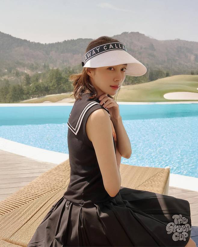 스포티한 매력이 돋보이는 골프 웨어 룩을 선보이고 있는 이민정. 네이비 컬러의 슬리브리스 골프 원피스에 세일러 칼라 디테일로 클래식한 감각을 더했다. 'AWAY CALLA' 로고가 새겨진 화이트 바이저로 스포티한 룩을 완성하면서도 세련된 분위기를 놓치지 않고 있다. 푸른 수영장과 산을 배경으로 한 고급스러운 리조트에서 여유로운 포즈를 취하며 우아함과 스포티함을 동시에 표현하고 있다. 미니멀한 액세서리 연출로 골프 웨어의 세련미를 한층 더 강조하고 있다.