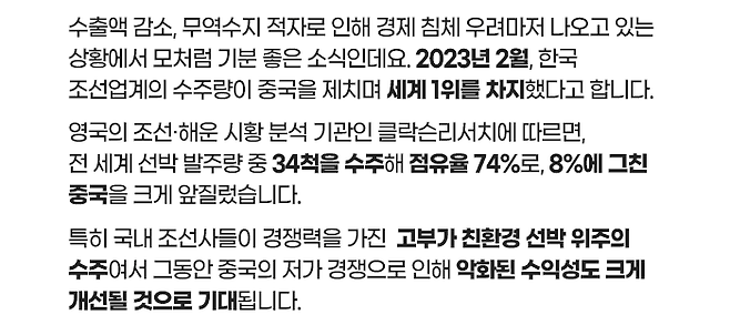 다행히 이런 위기를 극복하고 2023년 흑자 전환까지 예상될 정도로 조선업이 재도약을 하였습니다. 하지만, 국내 조선산업이 모처럼 맞은 호황기에 안주하지 않고, 경기변동에도 흔들림이 없는 조선산업의 비즈니스 전략과 정책을 개발하여 꾸준한 성장을 이어나가길 기원합니다.