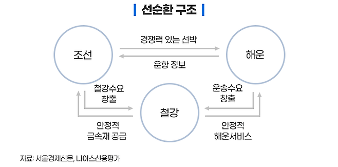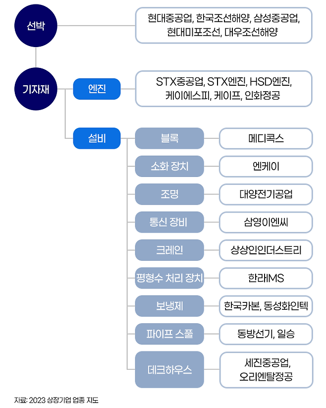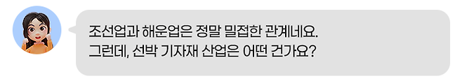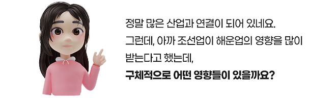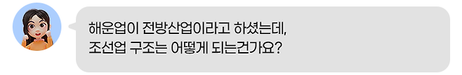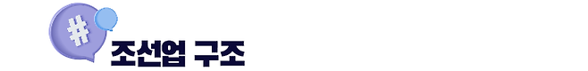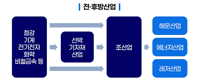 조선업의 구조는 전방산업으로 해운·에너지·레저산업이 있고, 후방산업으로 철강·기계·전기·전자화학·비철금속 등이 있으며 이들 산업과의 연관효과가 아주 큽니다.