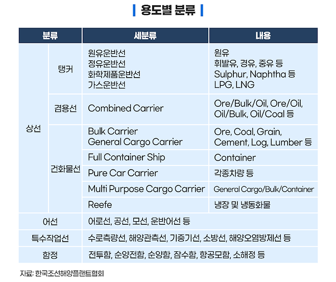 조선업은 각종 항해용 선박과 준설선, 시추대 및 부유 구조물 등의 기타 비항해용 선박을 건조하는 제조업입니다. 선박의 종류는 매우 다양한데요. 보통 사용 목적에 따라 상선, 어선, 특수작업선, 함정 등이 있고, 시장 규모가 큰 것은 상선입니다.