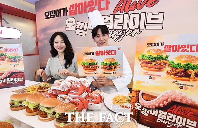 [더팩트ㅣ서예원 기자] 롯데GRS(대표이사 차우철)의 버거 프랜차이즈 롯데리아가 30일 오전 서울 용산구 롯데리아 숙대입구점에서 '오징어 얼라이브 버거' 출시 기념행사를 진행한 가운데 모델들이 제품을 선보이고 있다.