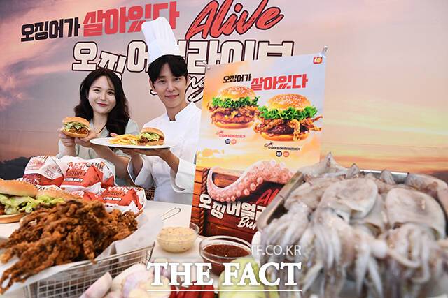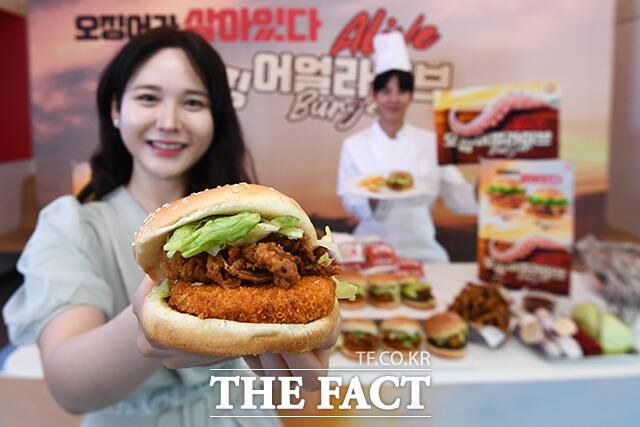 '오징어 다리가 통째로'...롯데리아, 오징어 얼라이브 버거 출시 [TF사진관]