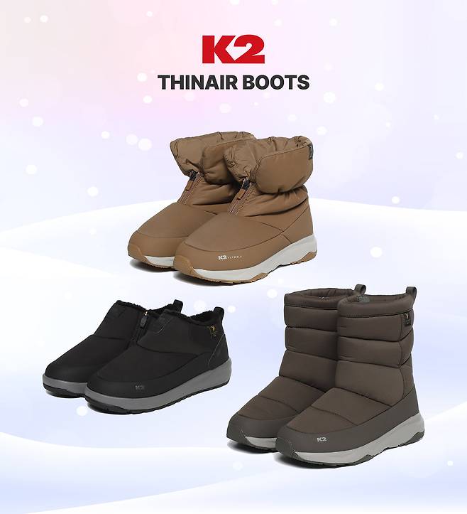 아웃도어 브랜드 K2가 혁신적인 다운 패브릭인 씬다운을 적용해 보온성이 뛰어난 '씬에어 방한 부츠' 3종을 출시했다. K2씬에어 방한 부츠는 특허 출원 받은 세계 유일의 다운 패브릭인 '씬다운'을 사용해 뛰어난 경량성과 보온성을 제공한다. 부츠 내부에는 부드럽고 따뜻한 기모 안감을 적용해 포근한 착용감을 선사하며, 생활 방수 기능으로 겨울철 다양한 환경에서 실용적으로 착용할 수 있다.
