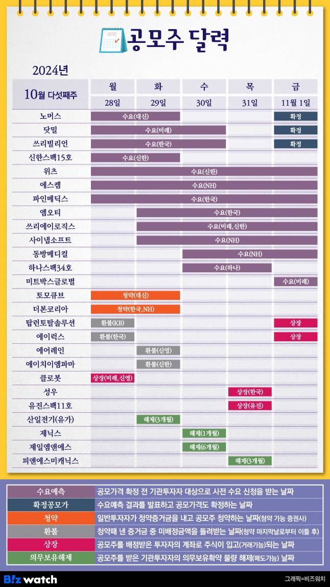 지난주부터 수요예측을 시작한 노머스는 29일, 닷밀과 쓰리빌리언은 30일에 수요예측을 마무리해요. 이 회사들은 수요예측 결과를 반영한 최종 공모가를 11월 1일 공시할 예정이에요.