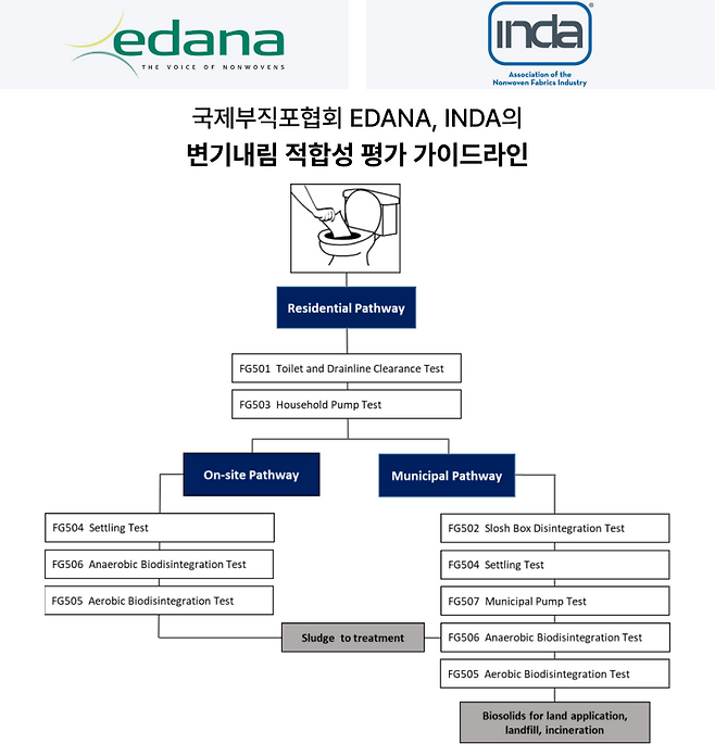 티슈를 변기에 버려도 괜찮은지를 평가하는 '변기내림적합성평가'인증도 있습니다. 변기내림적합성평가는 부직포협회(INDA/EDANA)에서 진행하는 제도로, 일회용 부직포 제품(물티슈)의 변기 가능성 평가를 위한 지침과 함께 유럽 전역에서 널리 쓰이는 인증입니다.