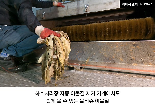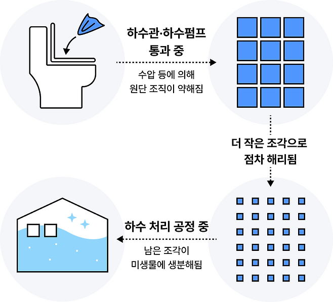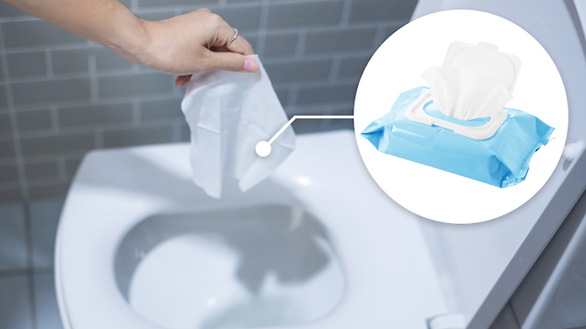 변기에 무심코 버린 물티슈는 분해되지 않고 하수도 필터에 걸려 사람이 일일이 건져 처리해야 하기 때문입니다.