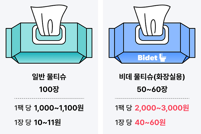 그래서 매수까지 고려한 1매당 가격은 일반 물티슈가 10~11원 수준임에 반해 비데 물티슈는 1매당 40~60원 정도로 볼 수 있습니다. 즉, 일반 물티슈에 비해 4~6배정도 비싼 셈입니다.