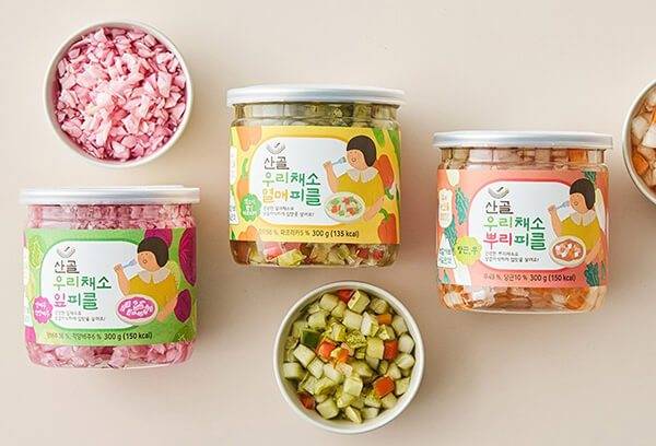 ‘에코맘의산골이유식 산골 우리채소 피클’은 오이부터 사과까지 우리 땅에서 자란 채소만으로 만든 순한 피클이다. 사과식초에 깔끔하게 절여 만들어서 특유의 새콤달콤한 감칠맛을 살렸다. 국산 매실 원액과 국산 사과농축액으로 만든 식초를 사용해 자연스럽고 균형 잡힌 단맛을 즐길 수 있다. 뚜껑에 숨구멍이 있는 전용 용기에 담겨 제공된다. 우리채소잎피클, 우리채소뿌리피클, 우리채소열매피클의 3종으로, 가격은 6,000원이다.