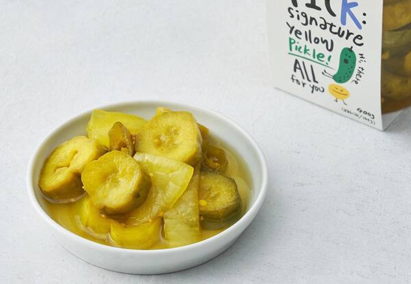 카페마마스는 2002년 서소문의 작은 가게로 처음 시작한 매장이다. 카페마마스 매장에서도 입소문이 자자한 사이드 메뉴인 ‘시그니처 옐로우 피클’을 가정에서 배달식으로 만날 수 있다. 도톰하게 썰어서 아삭한 식감이 살아있는 오이는 물론, 개운함을 더하는 양파와 청양고추도 담겼다. 머스타드 씨드, 터마릭 가루, 샐러리 씨앗 등 천연 향신료와 발효식초를 사용해 자연스러운 풍미를 담았다. 가격은 6,500원이다.