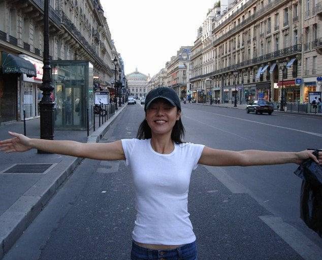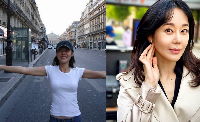 배우 김윤진의 캐주얼 스트리트룩을 살펴보겠다. 흰색 반팔 티셔츠와 데님 팬츠, 그리고 블랙 캡 모자를 매치해 심플하면서도 활동적인 분위기를 연출하고 있다. 자연스럽게 펼친 팔과 환한 미소가 자유분방한 에너지를 강조하며, 도시적 배경과 조화를 이루는 편안한 스타일링이 돋보인다