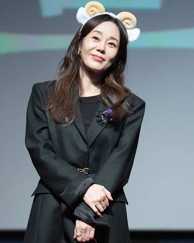 김윤진은 블랙 슈트에 동물 귀 머리띠를 더해 색다른 포멀룩을 선보이고 있다. 단정한 블랙 재킷과 팬츠, 그리고 허리 벨트로 포인트를 주며, 귀여운 머리띠로 포멀함과 유쾌함을 동시에 표현하고 있다. 전체적으로 차분하면서도 개성 있는 스타일이 인상적이다