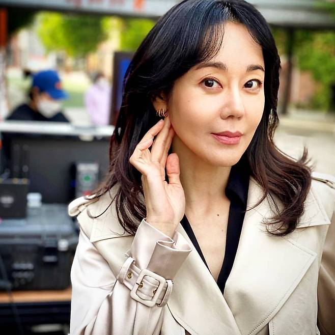 트렌치코트를 활용한 김윤진의 클래식룩이 눈길을 끈다. 크림색 트렌치코트와 블랙 이너를 매치해 세련된 도시 여성의 이미지를 연출하고 있다. 자연스럽게 넘긴 머리와 심플한 이어링이 고급스러운 분위기를 더하며, 전체적으로 우아함이 강조된다