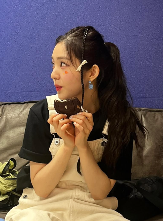 사진 속 아이린은 블랙 반팔 티셔츠 위에 아이보리 톤의 오버올을 매치해 내추럴하면서도 발랄한 분위기를 연출했다.