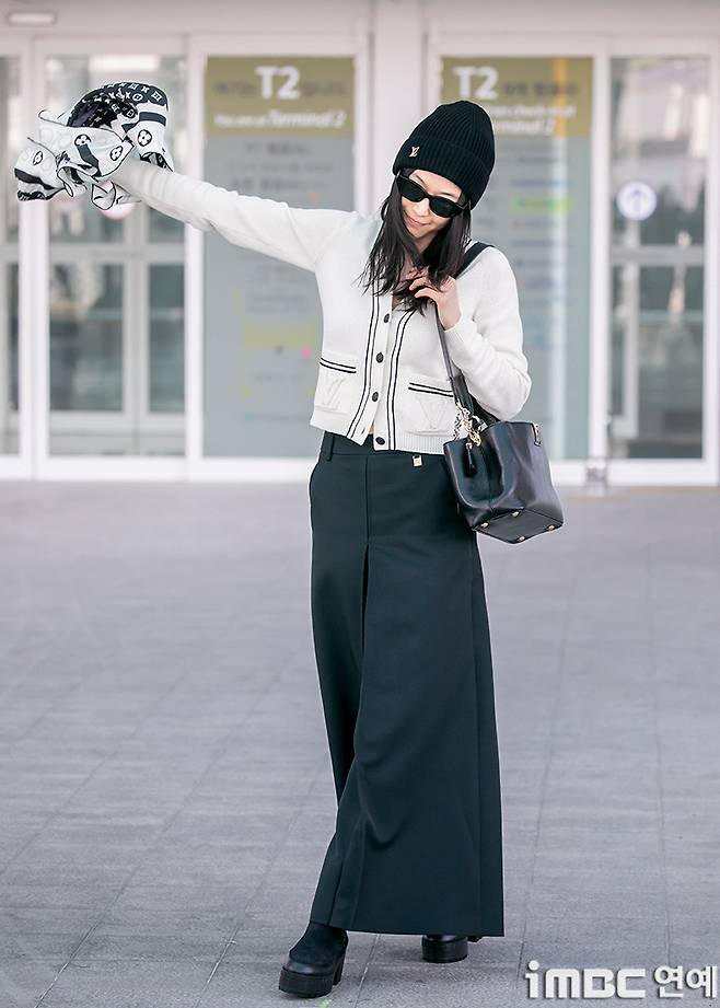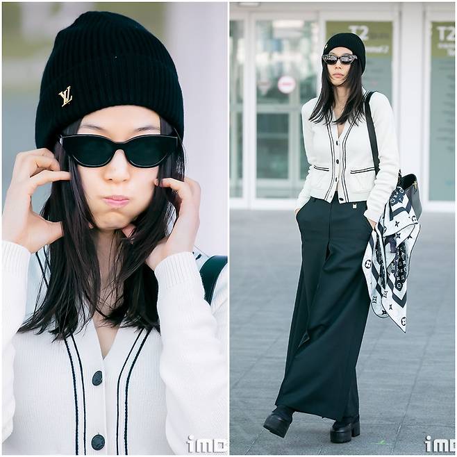 비니, 선글라스, 플랫폼 슈즈로 스트릿 감성을 더하면서도 루이비통 아이템으로 럭셔리한 요소를 조화롭게 믹스한 전지현의 공항패션!