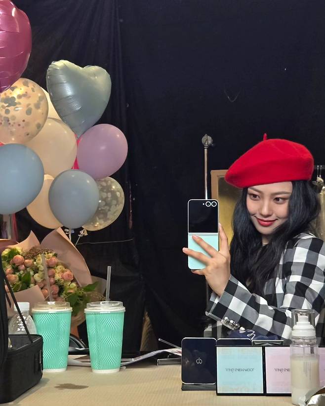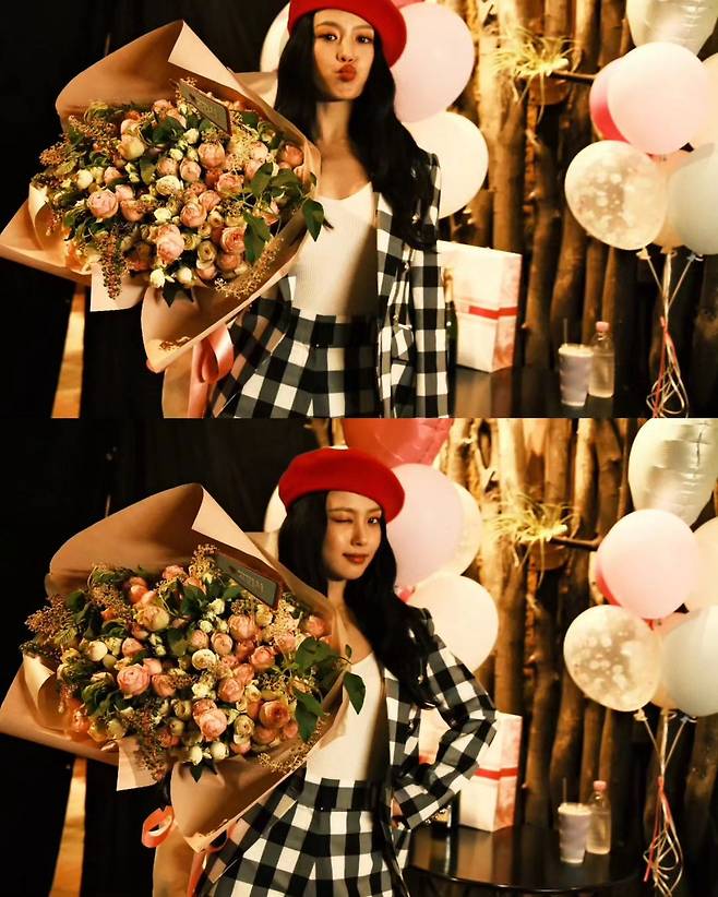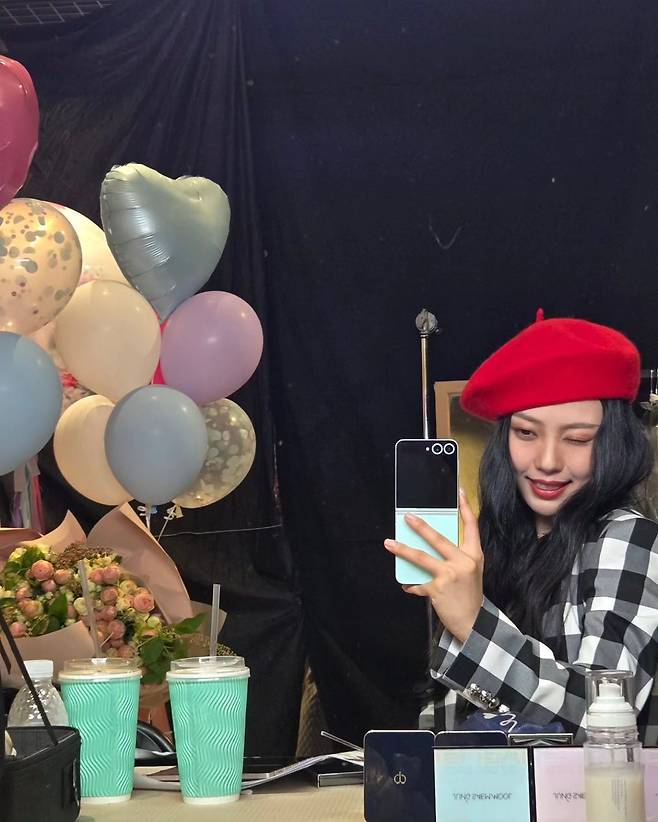 사진 속 고민시는 흰티를 이너로 입고 블랙 체크 자켓과 팬츠 셋업을 입고 빨간 베레모를 써서 시크하면서 러블리한 코디를 선보였다.