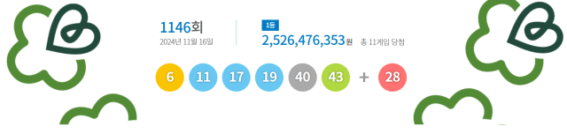 로또복권 운영사 동행복권은 제1146회 로또복권 추첨에서 '6, 11, 17, 19, 40, 43'이 1등 당첨번호로 뽑혔다고 16일 밝혔다.
