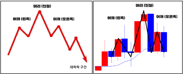 말하자면 하락하기 전 매도세가 집중되며 하락 압력이 높아지는 패턴을 ‘하락패턴’이라 하고, 상승하기 전 매수세가 몰리며 상승 동력이 축적되는 패턴을 ‘상승패턴’이라 부른다. 그런데 위 코스닥 차트는 그 하락패턴 중에서도 가장 강력하다고 불리는 ‘H&S 패턴(일명 머리&어깨 패턴)’이 완벽하게 만들어진 모습이다.