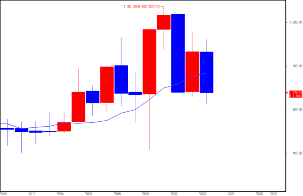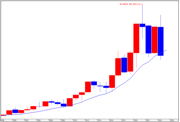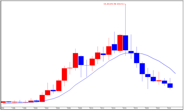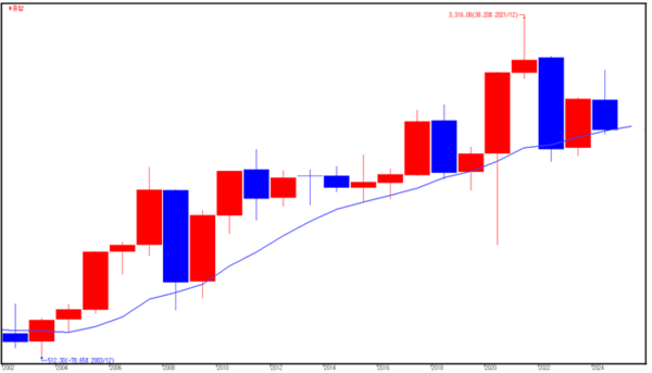 1998년 이후로 한번도 깨지 않았던 대지지선을 2024년에 깬 모습이다. 게다가 고점에서 하락패턴의 대표라 할 수 있는 ‘쌍봉패턴’을 만들면서 깬 모습이다. 어쩌면 본격적인 하락이 시작될 가능성이 매우 높아보인다.