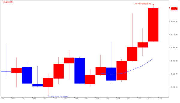 연초부터 지나치게 하락 위주의 차트만 소개한 듯해서 분위기 전환겸 최근 급등한 차트를 하나 소개하고자 한다. 밑에서 오랫동안 ‘삼중바닥패턴’을 만들더니 2022년부터 본격 상승을 시작한 원달러 환율의 연봉차트다. 그나마 상승압력을 최소화하려던 그간의 노력들이 무색하게 최근 정치상황이 급변하면서 아예 날개를 달았다.