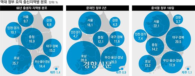 충청 출신은 총 27명(14.2%)으로 2019년(12.1%·28명)보다 조금 비율이 높았지만, 여전히 출생자 비율(16.9%)에는 미치지 못했다. 국민의힘이 지난 대선과 지방선거에서 윤 대통령 아버지 고향이 충남 공주인 점을 들며 윤석열 정부가 ‘충청도 정권’이라고 강조했지만 고위 공직에서 특별한 우대를 받진 못했다.