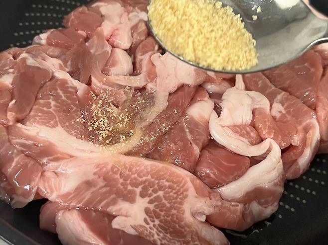 고기에 설탕을 먼저 뿌린 다음 설탕이 스며들 수 있게 섞어 주세요. 설탕을 가장 먼저 넣으면 고기 속까지 단맛이 은은하게 배어들고, 육질이 훨씬 부드러워지며 양념이 잘 뱁니다.